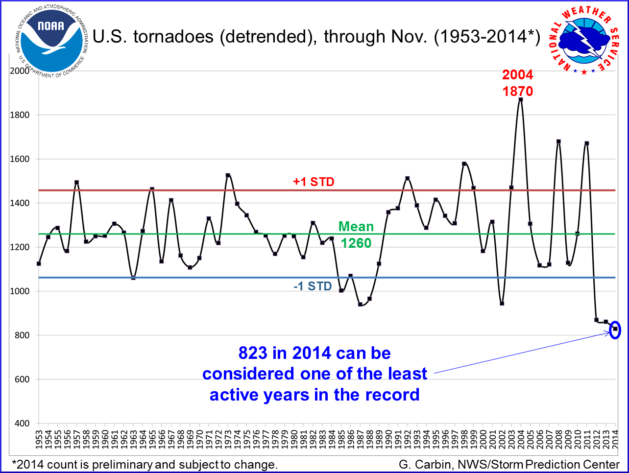 Here's the graph of the number of tornadoes in Colorado vs the number of hurricanes in the US from an earlier post. You can see that the number of tornadoes peaked in the 1990's and is currently declining toward a minimum.